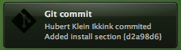 We must create the file post-commit in the directory .git/hooks. The file must have execute rights: $ chmod +x post-commit. In the first line of the file we make sure Groovy is used. In the rest of the script we use Groovy to invoke git log and get information about the commit. Then we create a message and invoke growlnotify with the correct arguments so Growl can show the message.